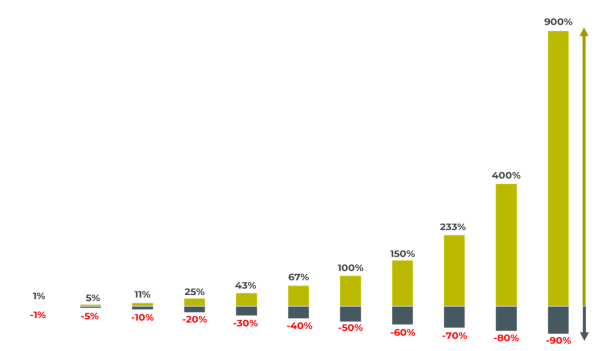 For tab og gevinster er ikke symmetriske. Falder en investering 5%, kræver det 5% at komme tilbage. Falder den 50%, kræver det 100%. Og falder den 60%, kræver det 150% at komme i nul.