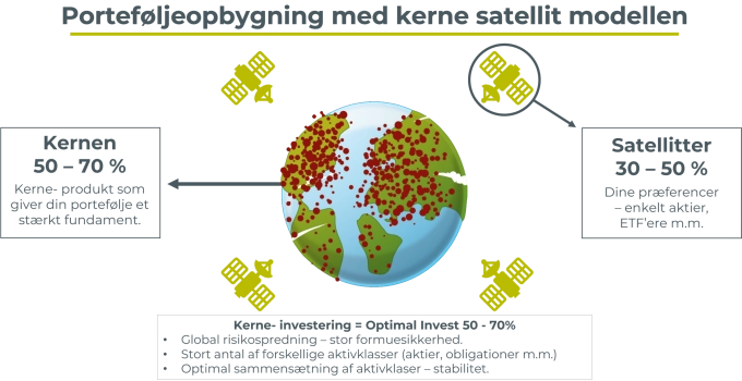 Kerne-investeringen udgør normalt 50–70 % af en portefølje. Kerne-investeringen fordeles, så den dækker hele markedet, så du får en stabil kerne. Flere af Optimal Invests produkter er rigtigt godt egnede som kerne-investeringer i din portefølje.