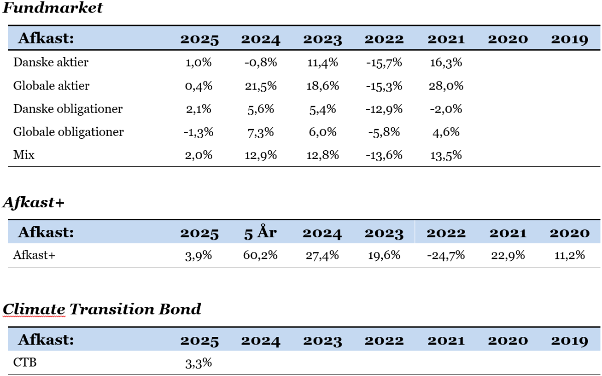 - Vi er tilbage i et nulrentemiljø på bankernes indlånskonti til både private og erhverv. Så kontanter, der ikke skal bruges her og nu, kan med fordel investeres med lav risiko i f.eks. Optimal Stabil, Climate Transition Bonds eller Fundmarket – Optimal Danske Obligationer for at sikre og forbedre din købekraft ved et forventet årligt afkast på 3,75%-5% p.a.
