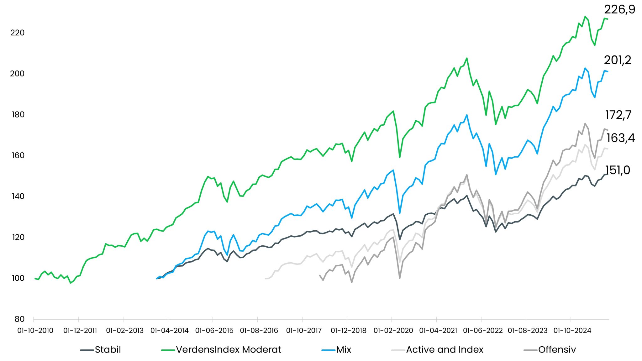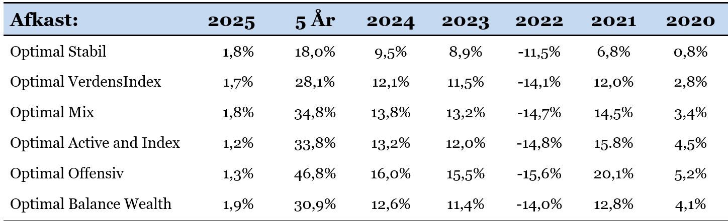 Historisk udvikling i Optimal invests afdelinger siden start: Hvad er 100 kr. blevet til?