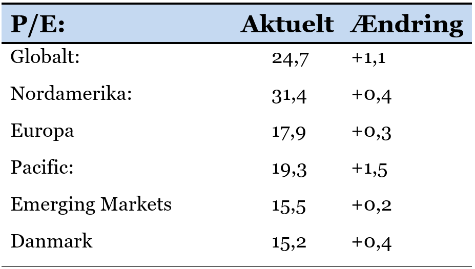 Globale aktiers værdiansættelse i forhold til P/E er blevet dyrere i løbet af den seneste måned. Pris i forhold til indtjening (P/E – prisen for 1 indtjeningskrone) for globale aktier bliver nu handlet til 24,7 mod 23,6 i sidste måned. Det er over det historiske niveau. Tabellen viser hvor meget 1 krones indtjening koster i DKK i skrivende stund: