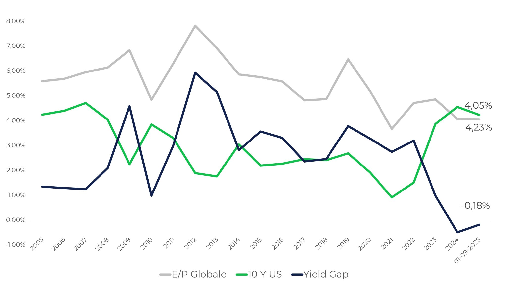 Videre ser vi som altid på prissætning af aktier i forhold til obligationer, det såkaldte Yield Gap. Yield Gap måler forskellen i afkast på aktier (indtjeningen ift. prisen på aktierne P/E) minus den 10-årige amerikanske statsrente. De globale aktier er stort set uforandredet i prissætning ift. obligationer, da forskellen (risikopræmien) er -0,18% mod -0,14% i sidste måned. hvilket er lavt historisk set. Risikopræmien er dog højere end ved starten af 2025. Den lave risikopræmie på aktier ift. obligationer understreger, at obligationer stadig fremstår attraktive.