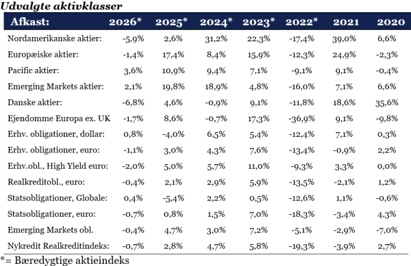 Som investor var der ingen steder at gemme sig i marts måned. Når inflationsbekymringer giver markant højere renter og bl.a. medfører store aktiefald, så fungerer risikospredning mindre godt, og det er kun kontanter, der holder sin værdi. I modsætning til sidste år, hvor vi også oplevede stor markedsuro efter Trumps ”Liberation Day”, så agerede dollaren denne gang sikker havn med en stigning på ca. 2,3%, hvilket var med til at tage toppen af kursfaldene. Det var årets store vindere frem til ultimo februar Pacific, Emerging Markets og Europa aktier, der oplevede de største fald, da alle regioner er netto-importører af olie og gas.