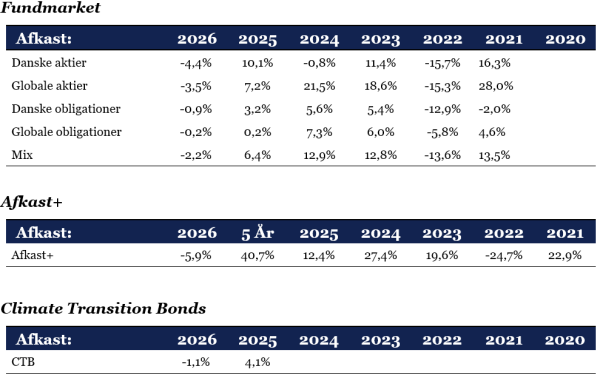 Vores afdeling for danske aktier har nu fået Finanstilsynets godkendelse og vil snarest blive børsnoteret som udbyttebetalende realisationsbeskattet. Med et merafkast på 13%-point over 4 år til C25 med den nuværende investeringsstrategi, så bliver afdelingen et stærkt kort i vores attraktive produktpalette. Vi udsender mere info snarest.