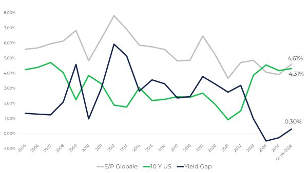 Videre ser vi som altid på prissætningen af aktier i forhold til obligationer, det såkaldte Yield Gap. Yield Gap måler forskellen i afkast på aktier (indtjeningen ift. prisen på aktierne P/E) minus den 10-årige amerikanske statsrente. De globale aktier er blevet billigere i prissætning ift. obligationer, da forskellen (risikopræmien) er +0,31% mod +0,19% i sidste måned selv efter den store stigning i markedsrenterne. Risikopræmien er dog stadig historisk lav. Den lave risikopræmie på aktier ift. obligationer understreger, at obligationer stadig fremstår attraktive.
